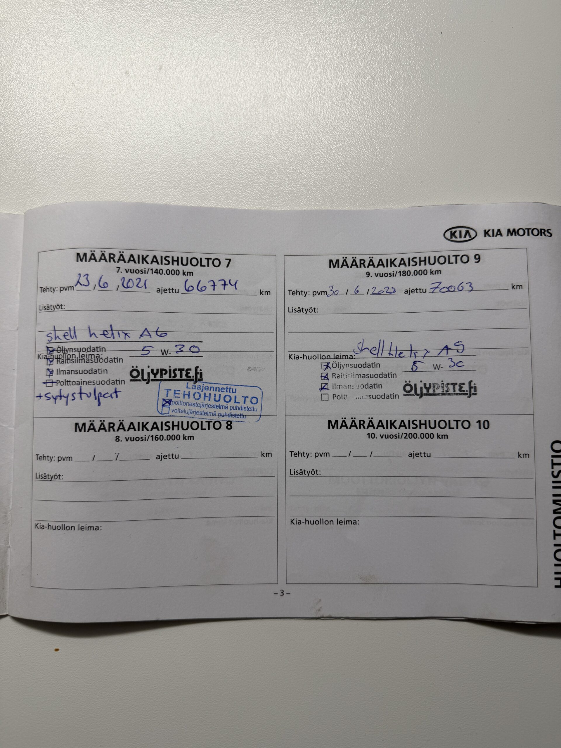 Mukaan paperinen huoltokirja, jonka mukaan auto huollettu viimeksi 30.6.2023, 70 063 km kohdalla